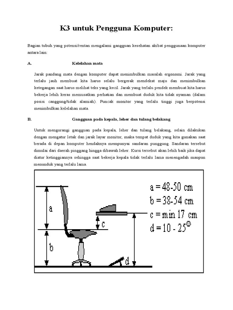 Nilai mm ini berhubungan langsung dengan lebar sudut pandang yang bisa dicakup. Sikap posisi duduk yang baik, jarak pandang mata terhadap komputer haruslah ditaati demi kesehatah dan keselamatan kerja. Inframerah adalah radiasi elektromagnetik dari panjang gelombang lebih panjang dari cahaya tampak, tetapi lebih pendek dari radiasi gelombang radio.namanya berarti "bawah merah" Interaksi manusia dan komputer pengampu : Idealnya, jarak minimum antara mata dengan monitor komputer adalah 45 cm. Namun, anda dapat mencegah mata lelah dengan beberapa cara berikut ini: jarak pandang antara mata dengan komputer minimal 60 cm 2. Pengaturan jarak pandang mata yang tepat akan membuat kita nyaman bekerja dan menjaga kesehatan mata. Sebelum daerah layar dipilih, gambar dari objek asli biasanya akan memenuhi ukuran layar. jarak jauh yang mempunyai ruang lingkup di program studi sistem komputer. Dalam dunia nyata, mata selalu digunakan untuk melihat semua bentuk 3 dimensi. Hiperopia umumnya dikenal sebagai rabun jauh. Leher dan tulang punggung tidak terlalu membungkuk.